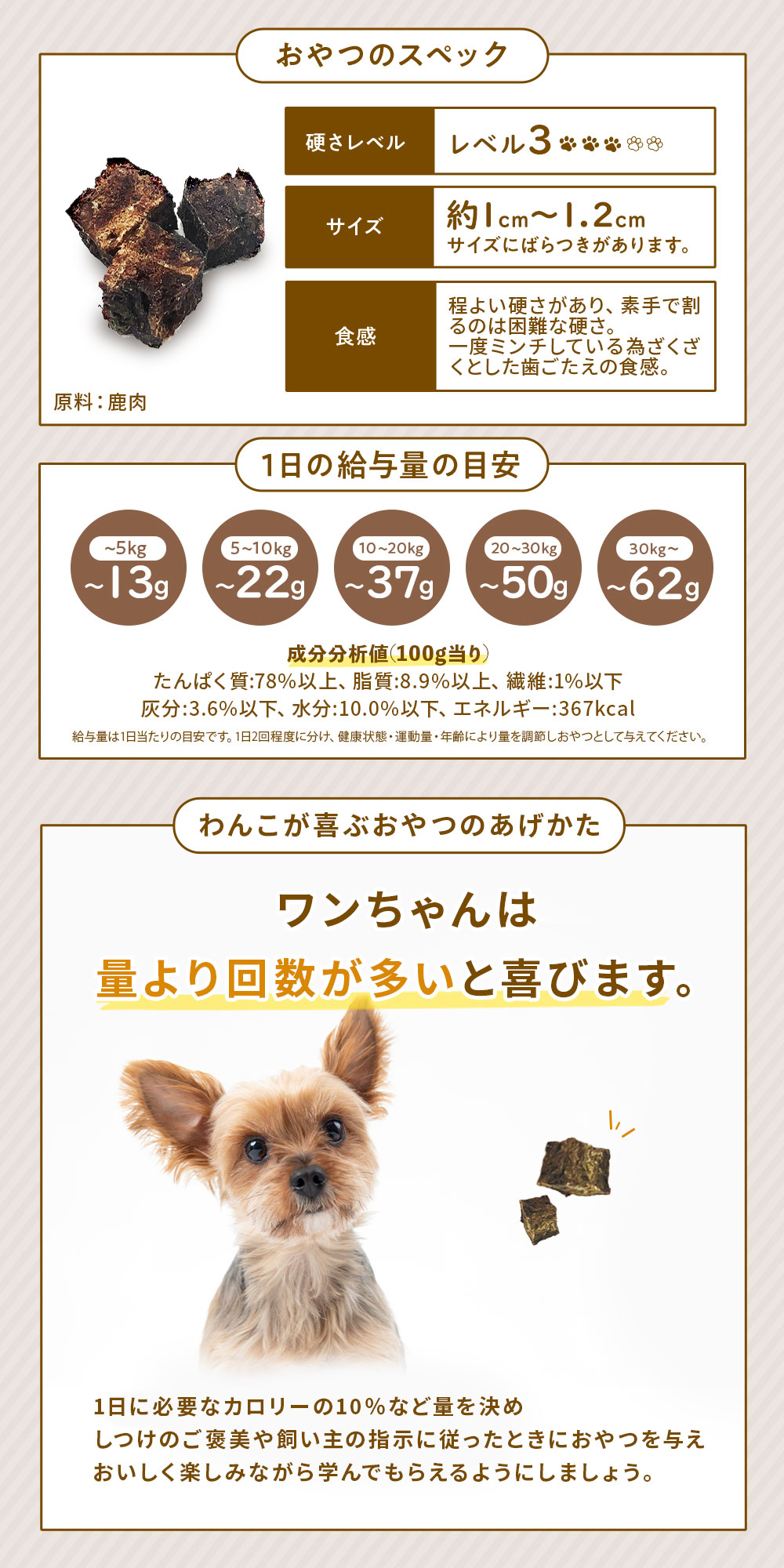 | 国産の鹿肉を一度ミンチし、ざくざく食感のキューブに仕上げました。1cm角で持ち運びやすくお散歩にもおすすめ♪