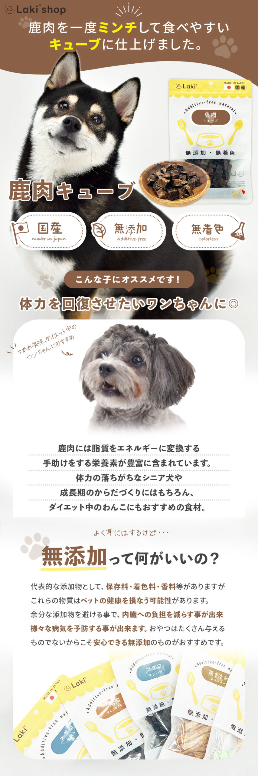| 国産の鹿肉を一度ミンチし、ざくざく食感のキューブに仕上げました。1cm角で持ち運びやすくお散歩にもおすすめ♪