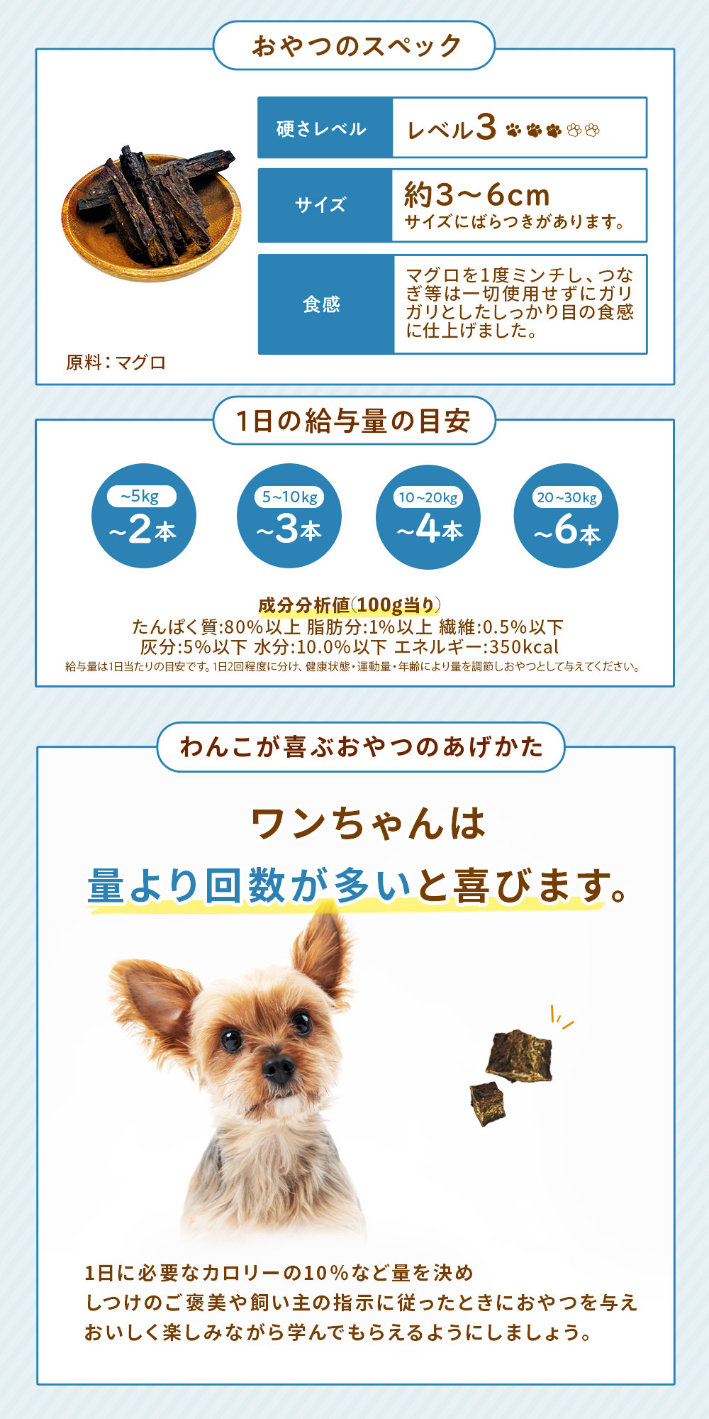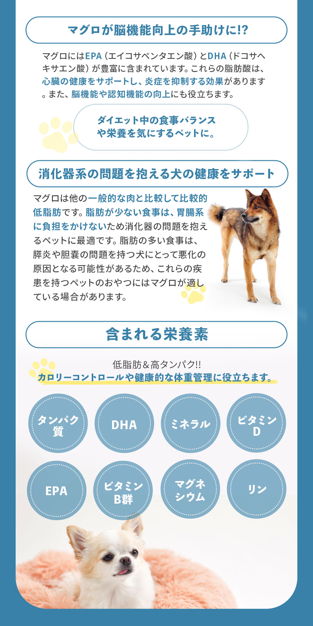 | ◆免疫力アップで様々な疾患予防 マグロには老化を防ぐ力を持つセレンが豊富です。セレンは細胞が傷つくのを抑える作用を持つため、ガン予防が期待されます。 さらにセレンが不足すると、免疫力の低下などが診られます。 マグロを積極的に摂取する事で免疫力を高め、病気に強い体をつくります。 ◆成長期の子犬の発達や高齢犬の認知機能をサポート 魚であるマグロには脳の発達と機能をサポートする効果があります。 ◆目の健康を保ち、血液をサラサラに ◆消化吸収に優れたたんぱく質が豊富 |